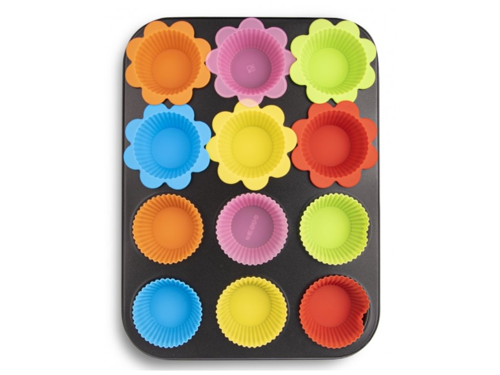 Praktickou formu s nepřilnavým povrchem můžete použít buď přímo, nebo s vloženými silikonovými košíčky, v nichž muffiny, cupcaky, sladké a slané tartaletky budete rovnou servírovat.