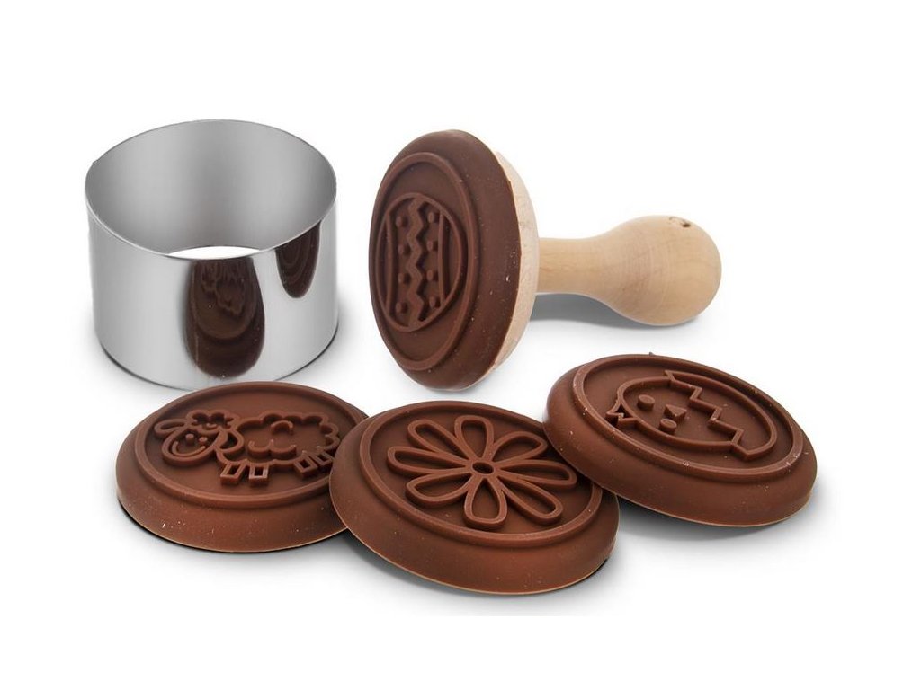 Nabízíme 4 varianty různých dekorů – silikonových snímatelných nástavců na dřevěný základ. Velmi rychle a snadno vytvoříte ornament na formičkou vykrojeném kolečku z těsta. Po upečení vypadají skvěle a potěší nejen děti. Materiál: dřevo, silikon, nerezová forma. Rozměry: pr. 6 cm, v. 9 cm. Formu a silikonové nástavce lze mýt v myčce.