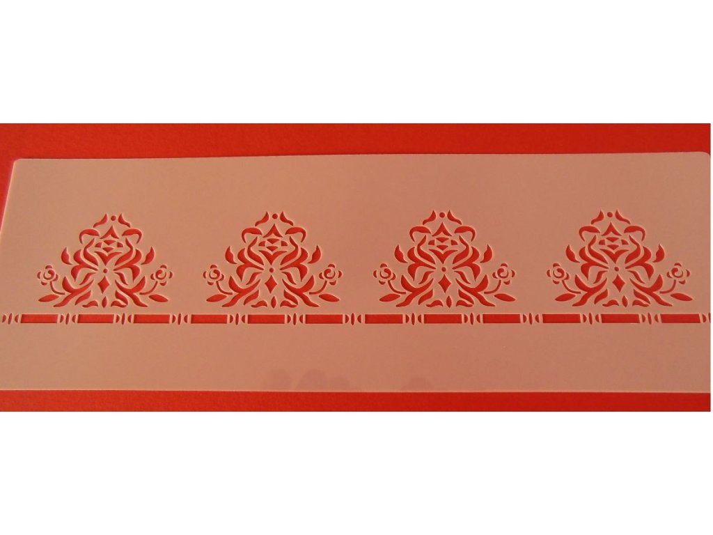Pomocí stencilu můžeme vcelku rychle dosáhnout honosného vzhledu dortů - stačí přiložit stencilu /šablonu/ na okraj dortu a štětcem nanášíme barvu na vykrojených plochách. Poté lze ještě dozdobit např. královskou glazurou nebo jedlými fixami, příp. štětcem.