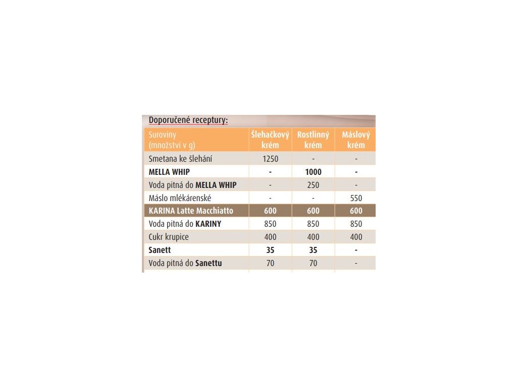 Šlehačkový krém: 500 g Karina Latte Machiatto, 650 ml voda do Kariny, 300 g cukr krupice, 1 l vyšlehané šlehačky - Karinu smíchat s vodou a cukrem, nechat 10 min odstát, přemíchat a přidat posutpně k ušlehané šlehačce